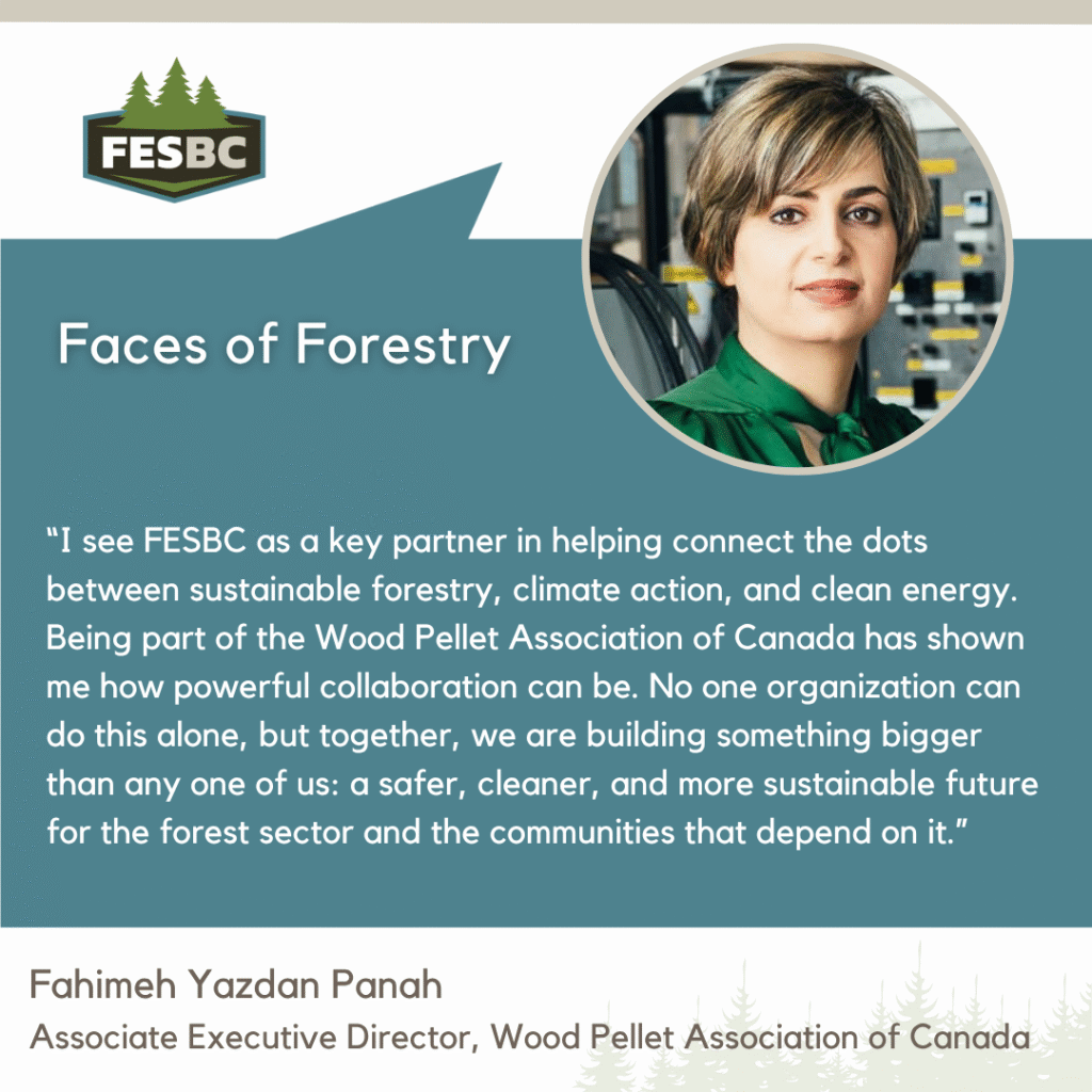 Faces of Forestry is an initiative of the Forest Enhancement Society of BC (FESBC) to highlight people doing great work to enhance our forests throughout British Columbia. This month, we feature Fahimeh Yazdan Panah, Associate Executive Director at the Wood Pellet Association of Canada.