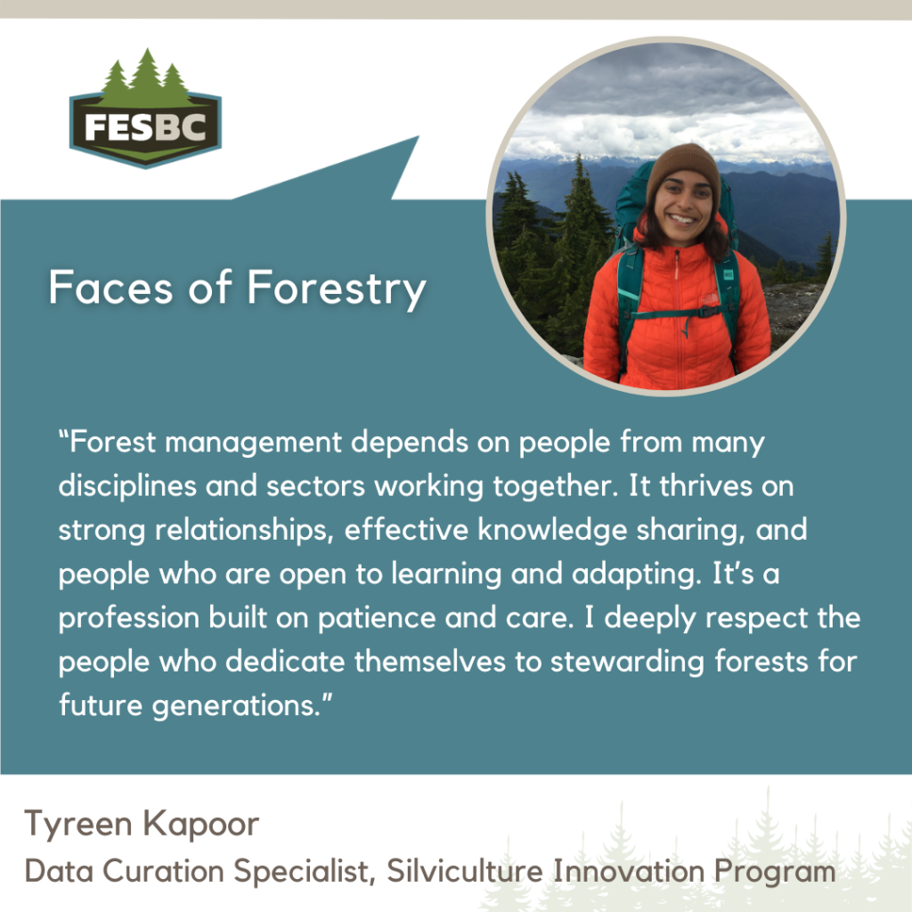 Faces of Forestry is an initiative of the Forest Enhancement Society of British Columbia (FESBC) to highlight people doing meaningful work to support healthy and resilient forests across British Columbia. This month, we feature Tyreen Kapoor, Data Curation Specialist for the Silviculture Innovation Program (SIP), led by the Bulkley Valley Research Centre. Through her work, she helps make forestry knowledge easier to find, understand, and use for people working in the sector across B.C.
