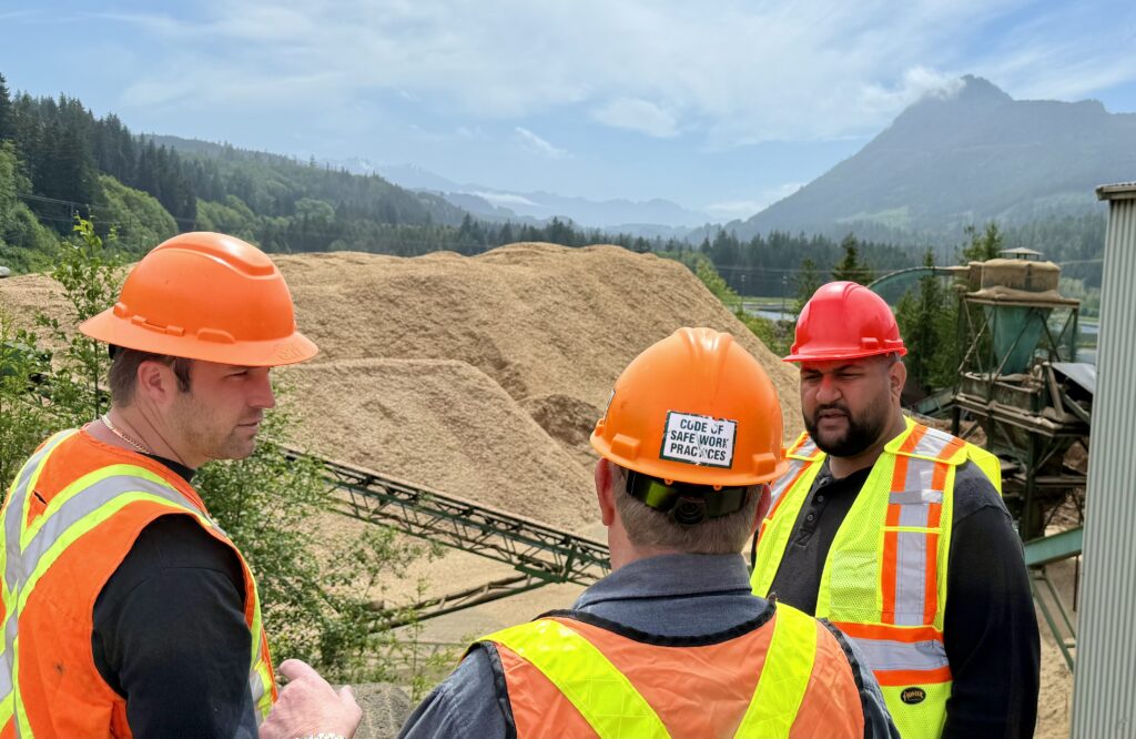 Warren Roberts from Wahkash Contracting and Doug Mosher, RPF, COO of Atli Resources tour Forest Minister Ravi Parmar around the Atli Chip site. Photo Credit: Atli Resources LP