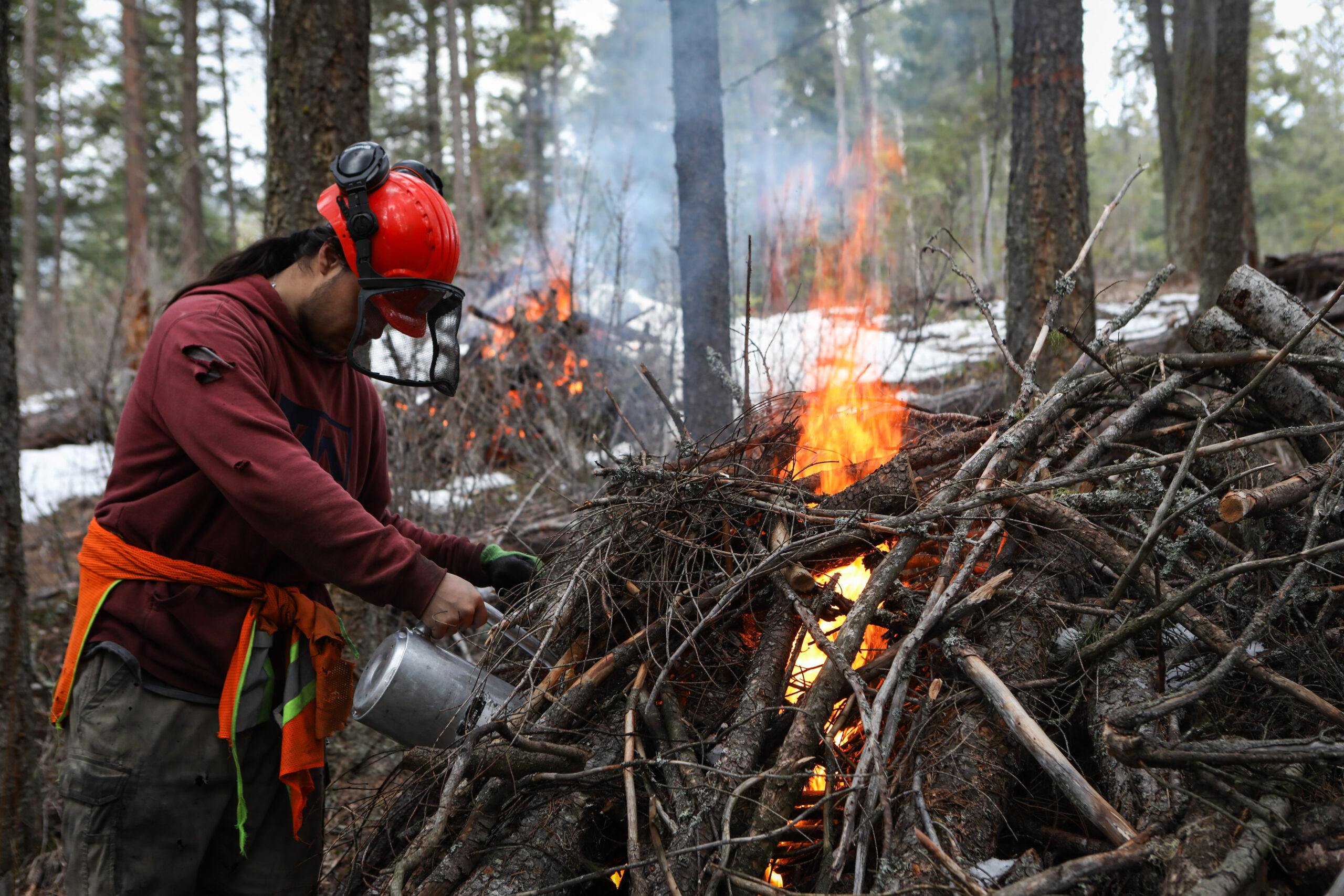 Keenau Saunders, a technician with Ntityix Resources LP, ignites a slash pile with a drip torch in the Glenrosa area in Westbank First Nation in syilx Okanagan homelands on March 20, 2025. Photo Credit: Aaron Hemens